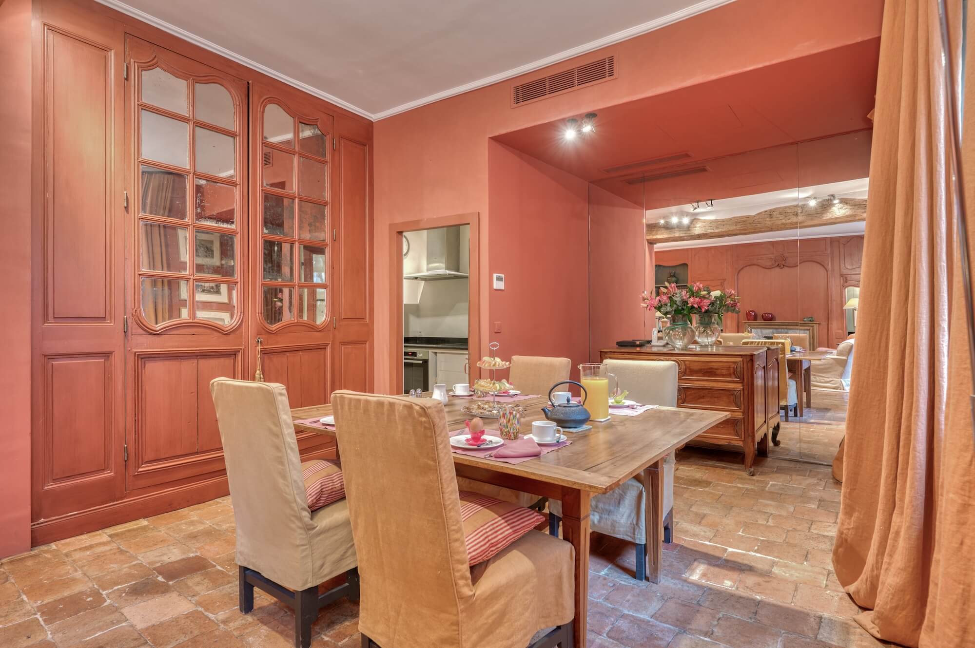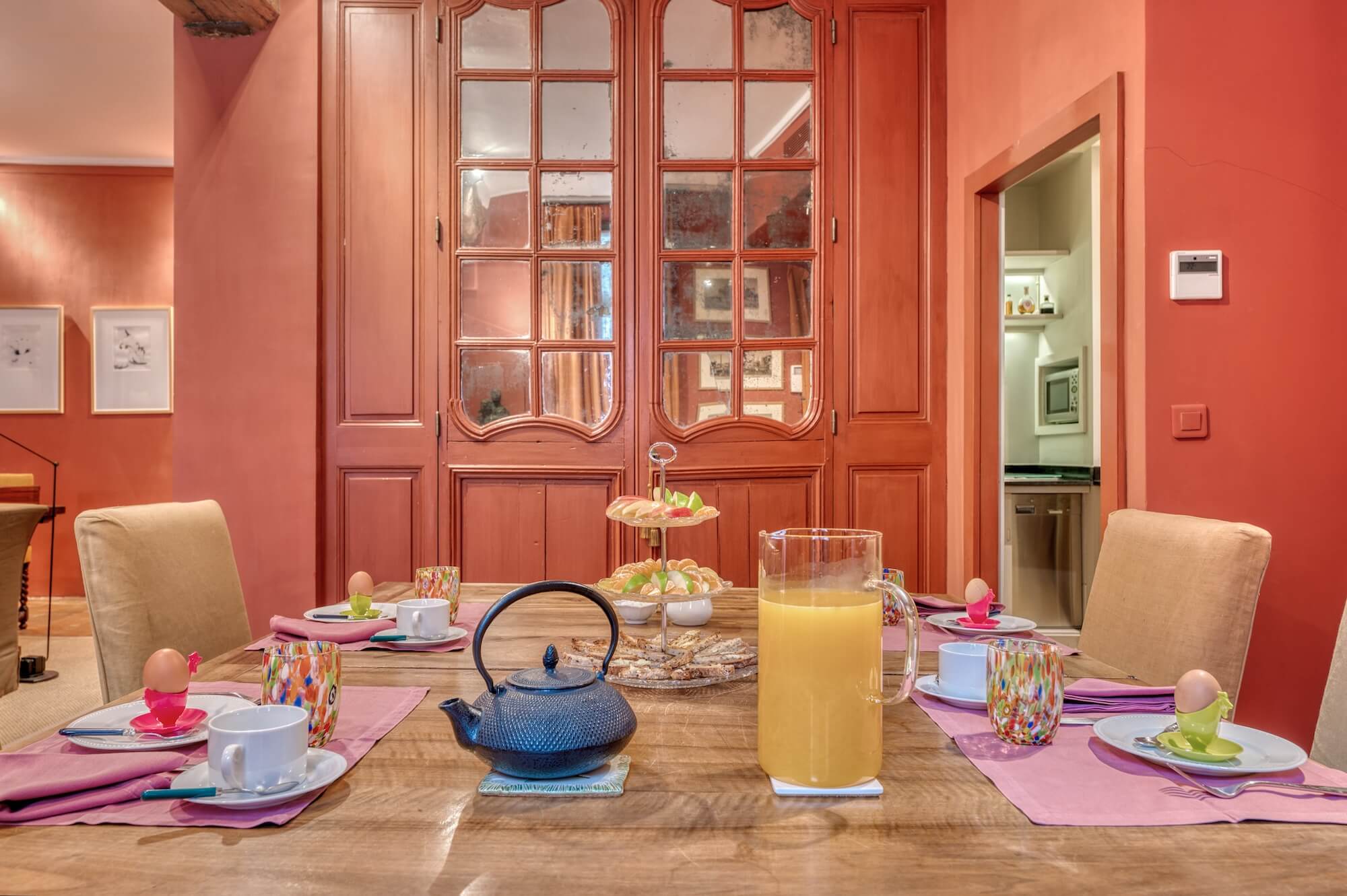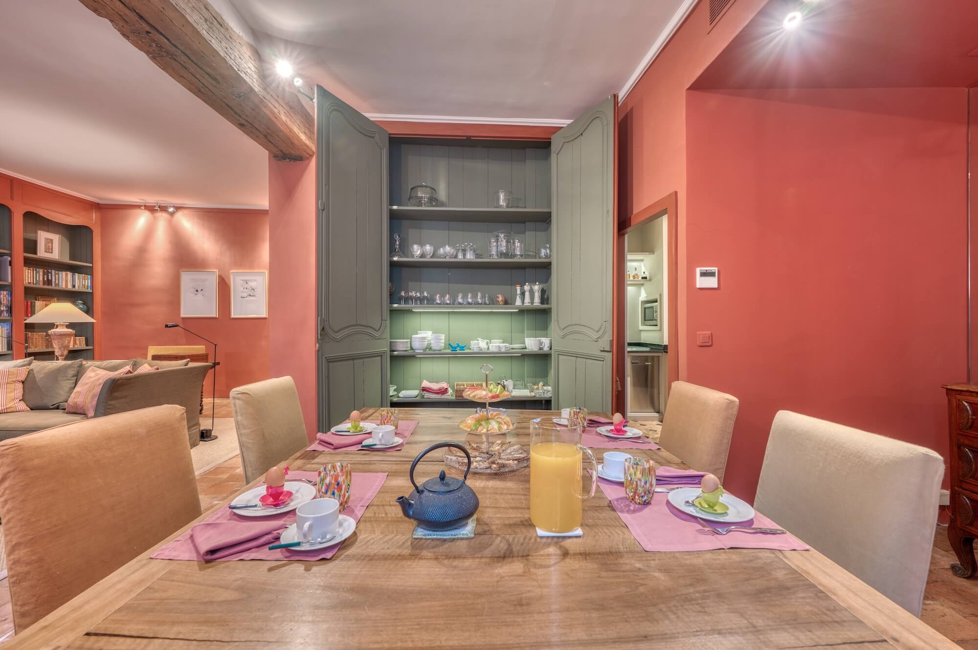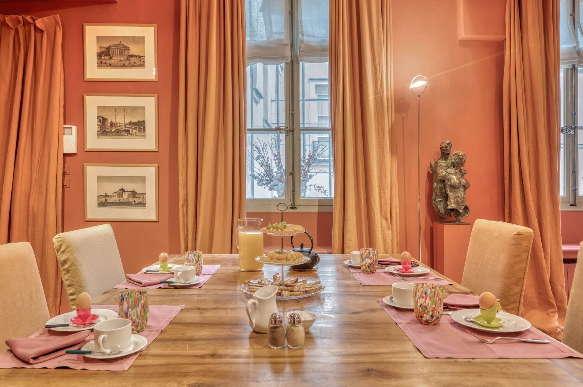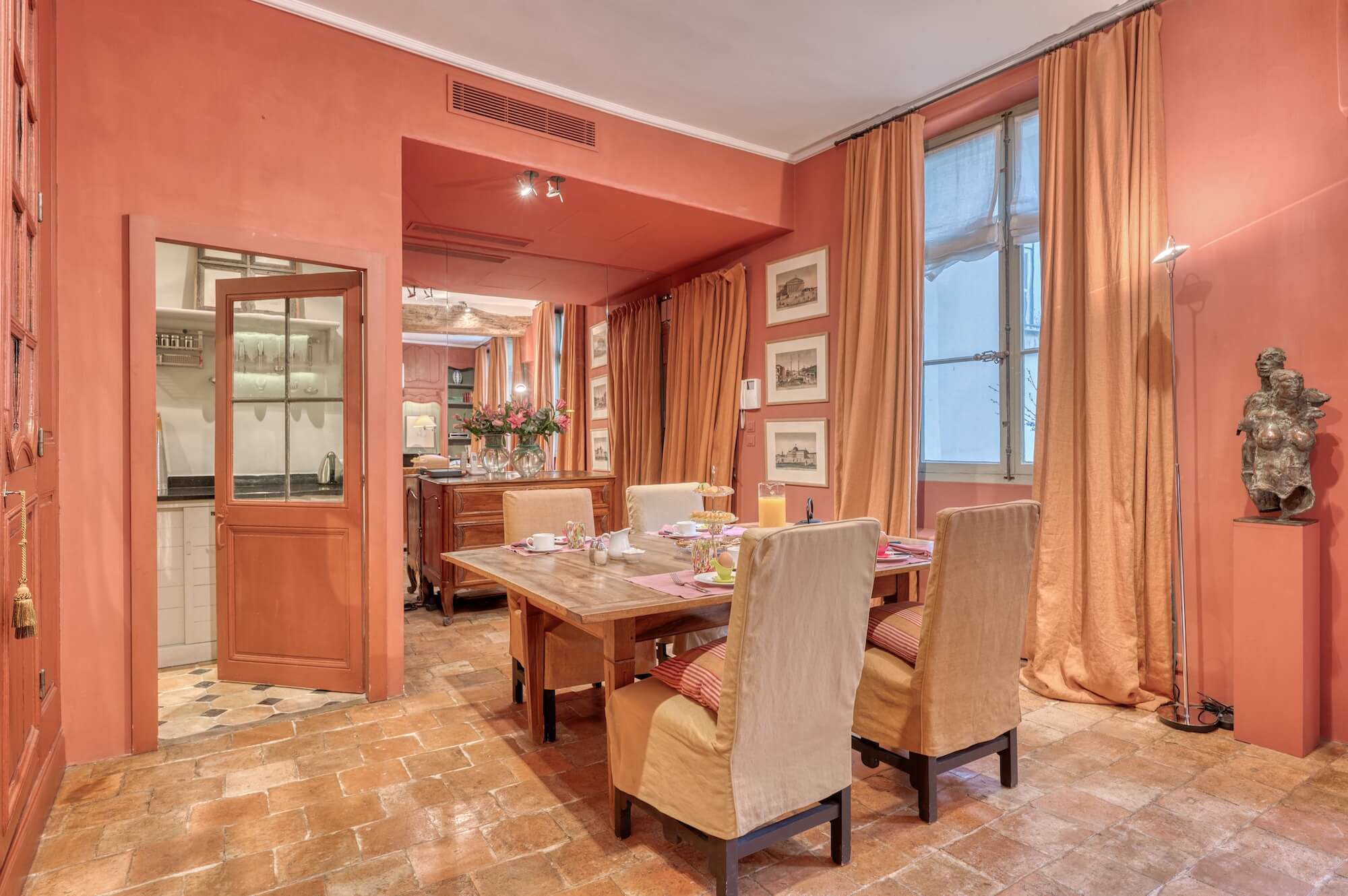 The roomy salon, complete with high windows, original exposed ceiling beams, and fireplace, create a particularly warm atmosphere where you’ll want to cozy up with a book after a long day exploring the city. A couch, two sitting chairs, and separate dining table area allow more than enough room for entertaining loved ones and guests alike.