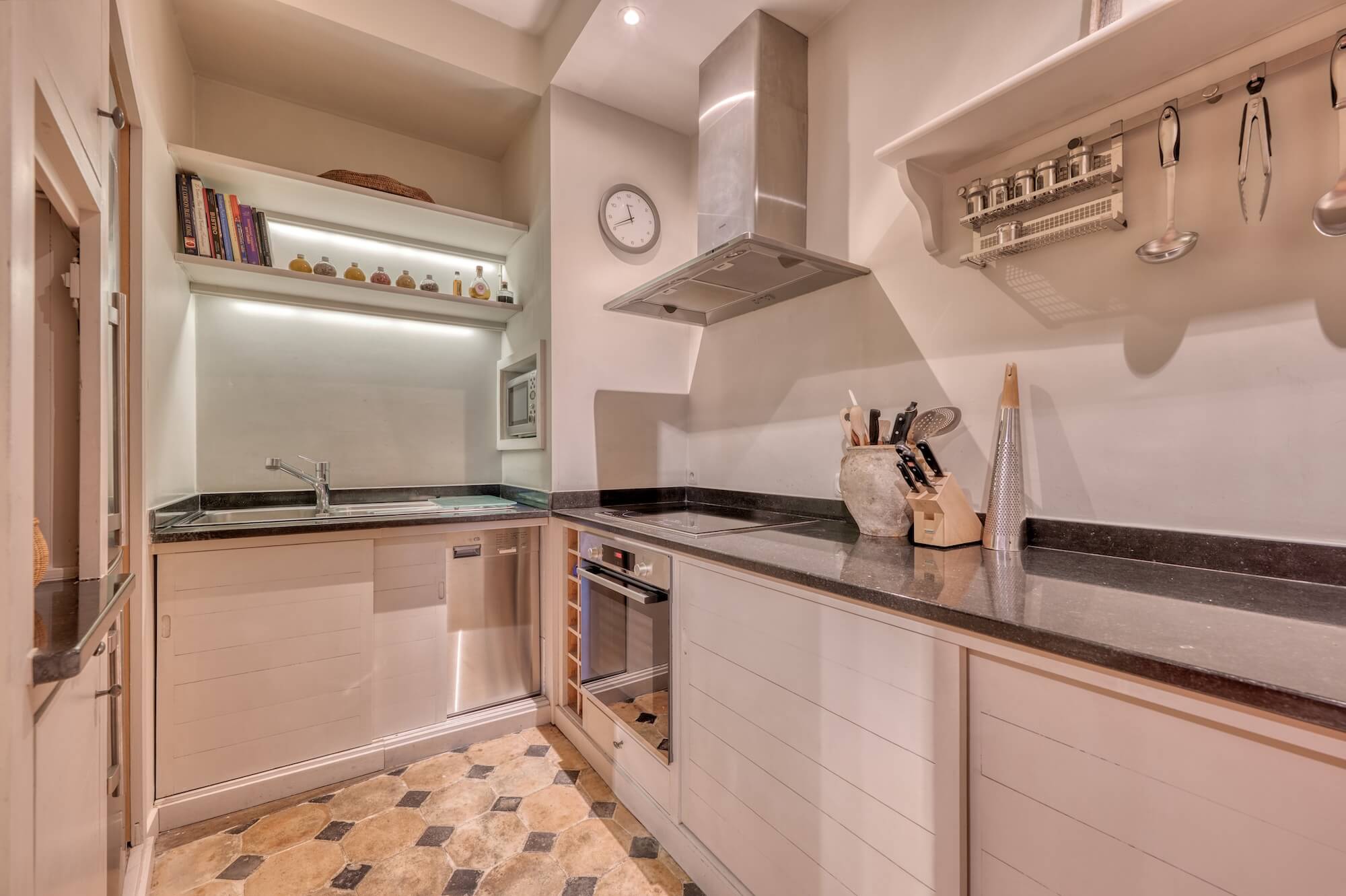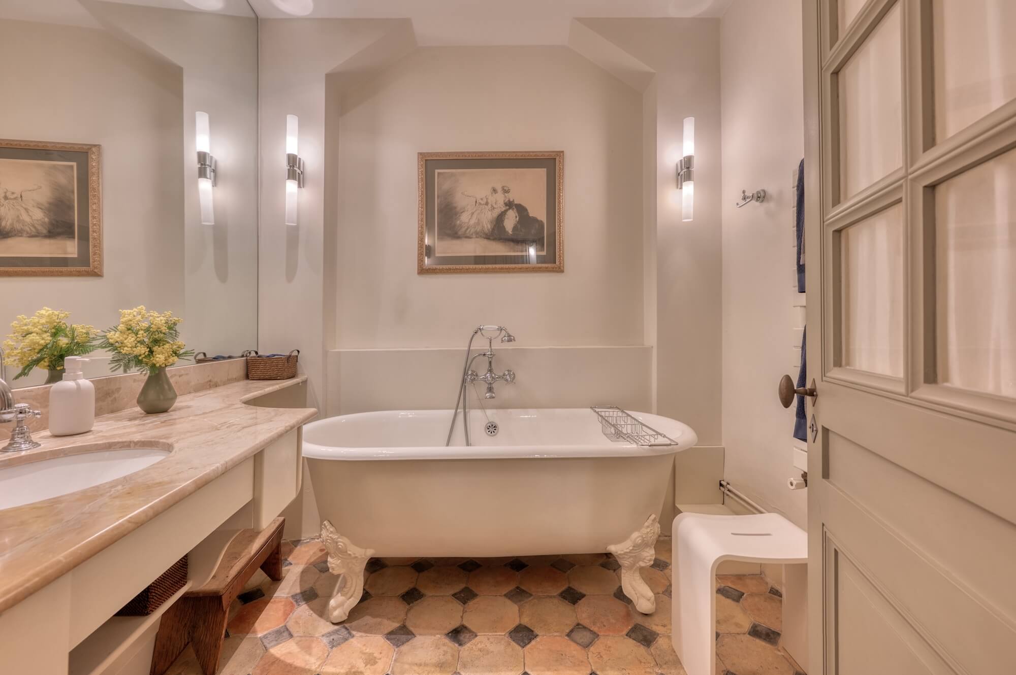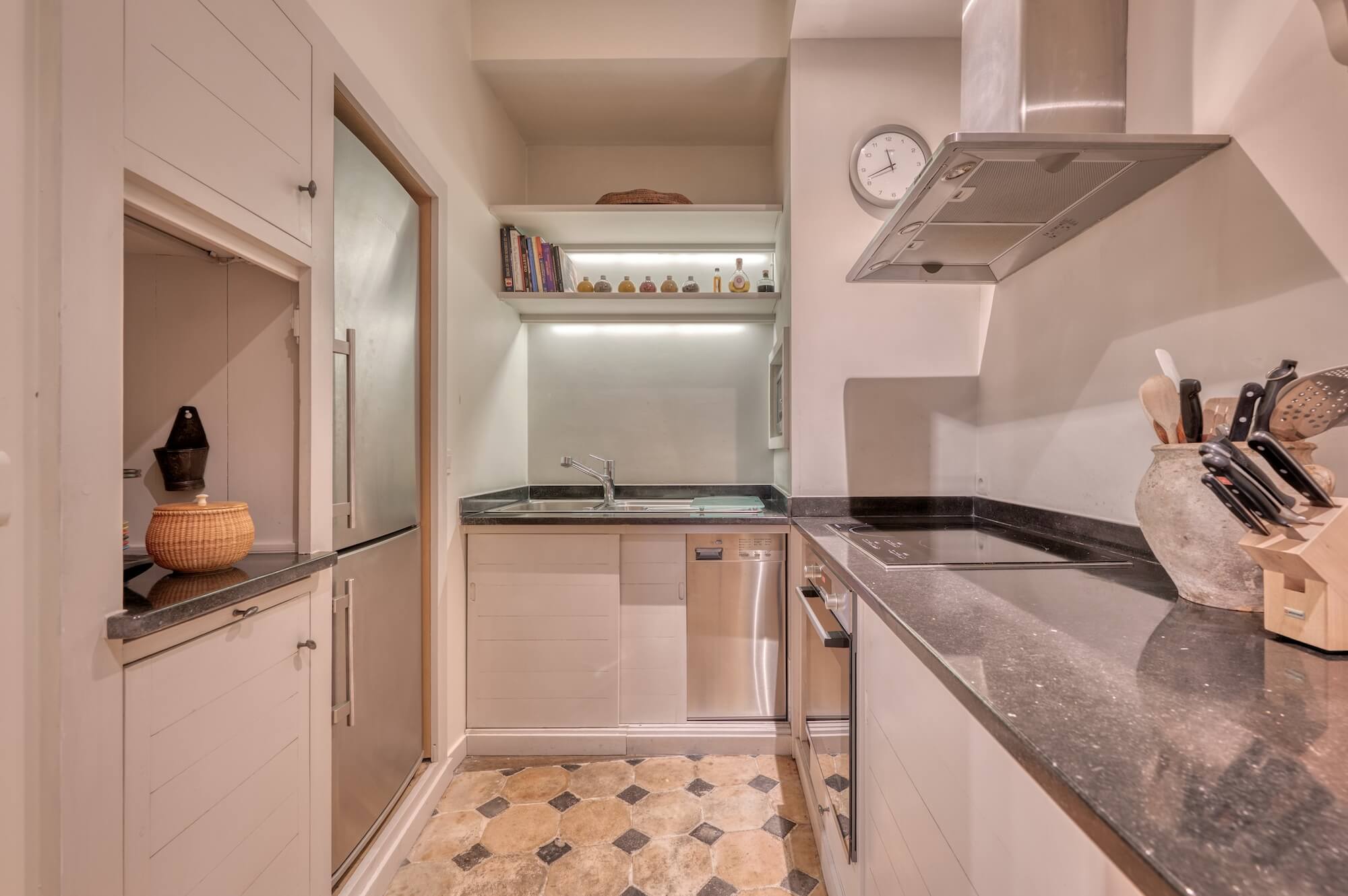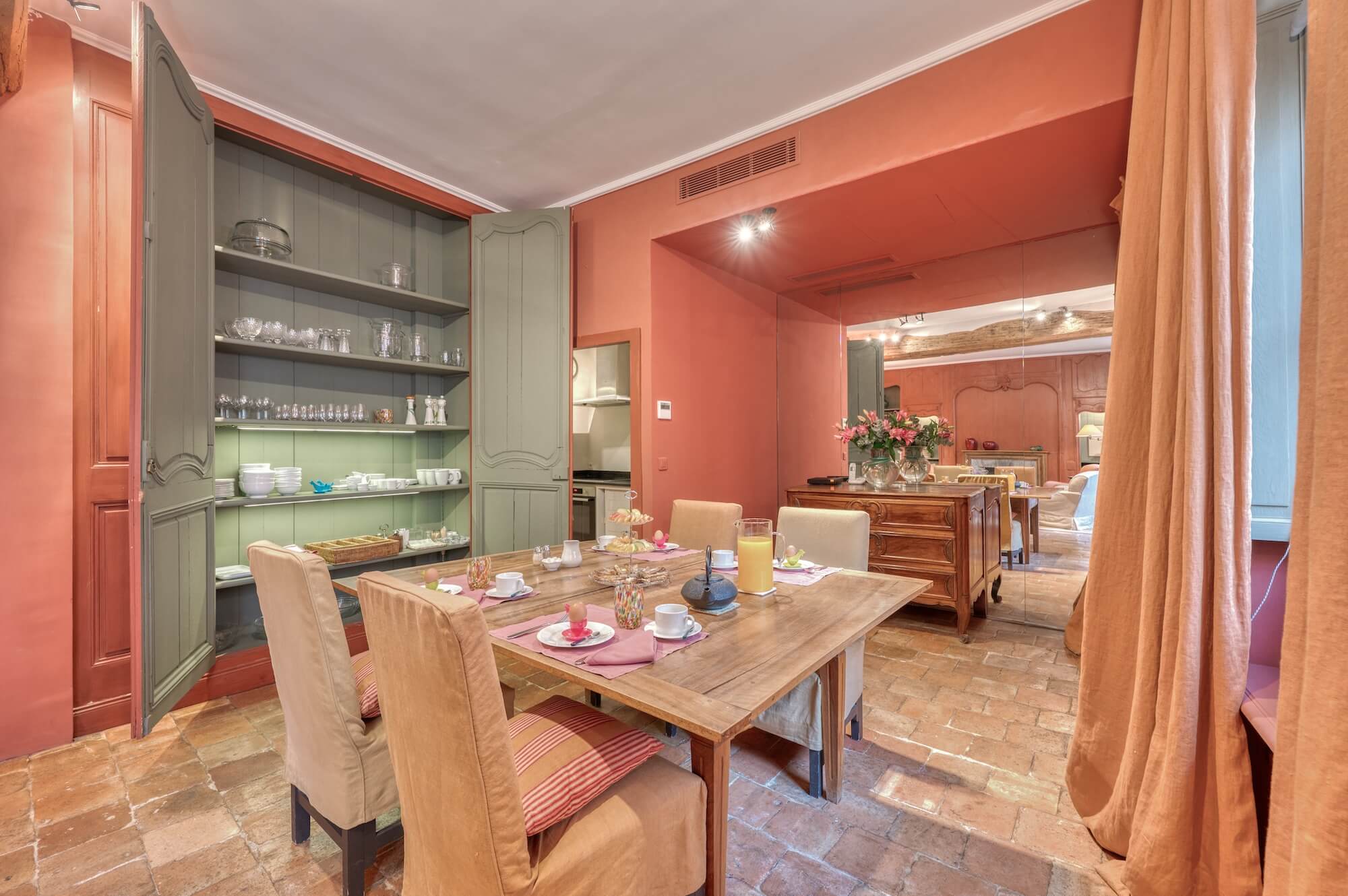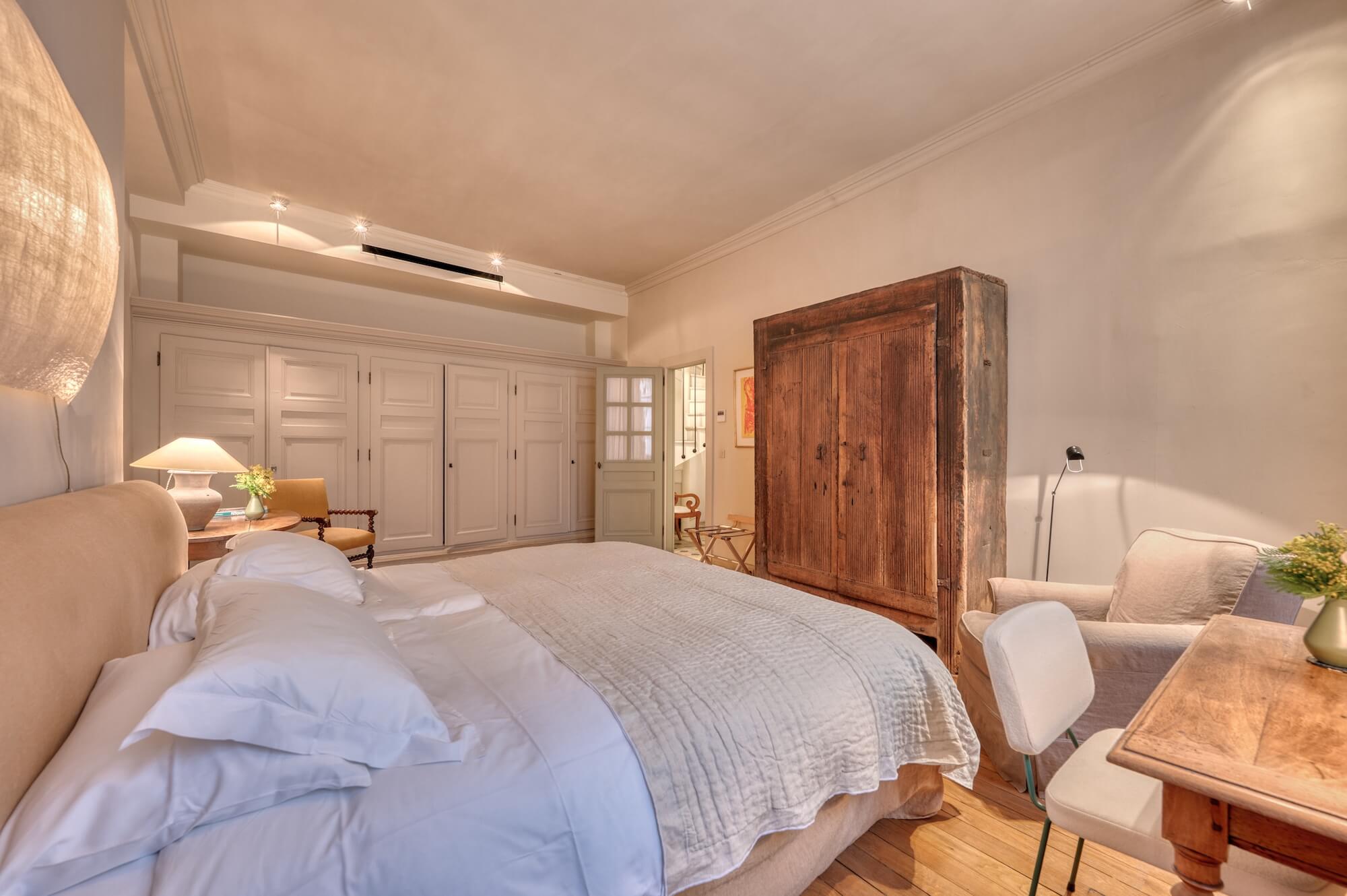 The roomy salon, complete with high windows, original exposed ceiling beams, and fireplace, create a particularly warm atmosphere where you’ll want to cozy up with a book after a long day exploring the city. A couch, two sitting chairs, and separate dining table area allow more than enough room for entertaining loved ones and guests alike.