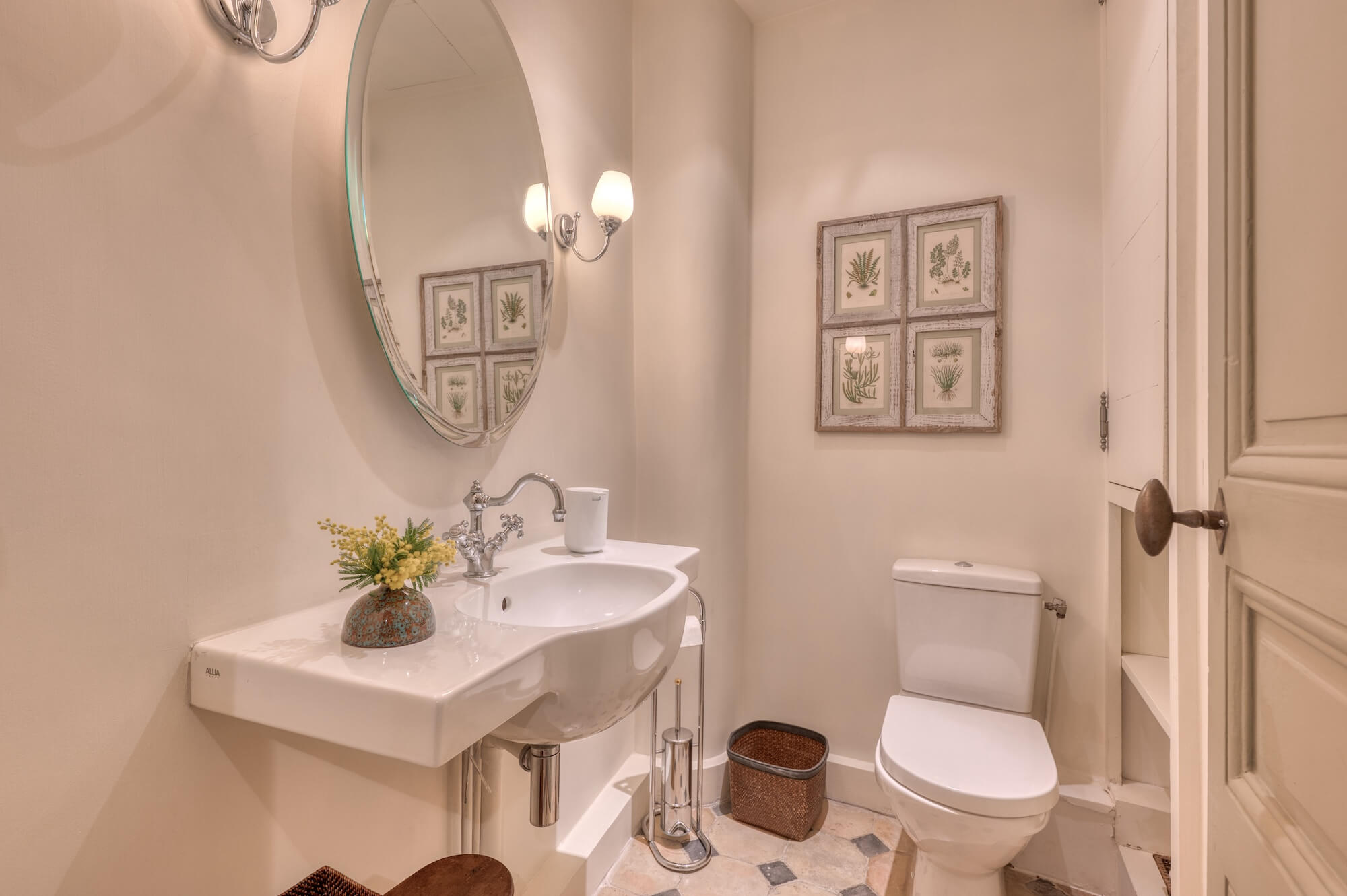 Tucked away by the staircase connecting the two floors is a guest bathroom fitted with a sink and a toilet.