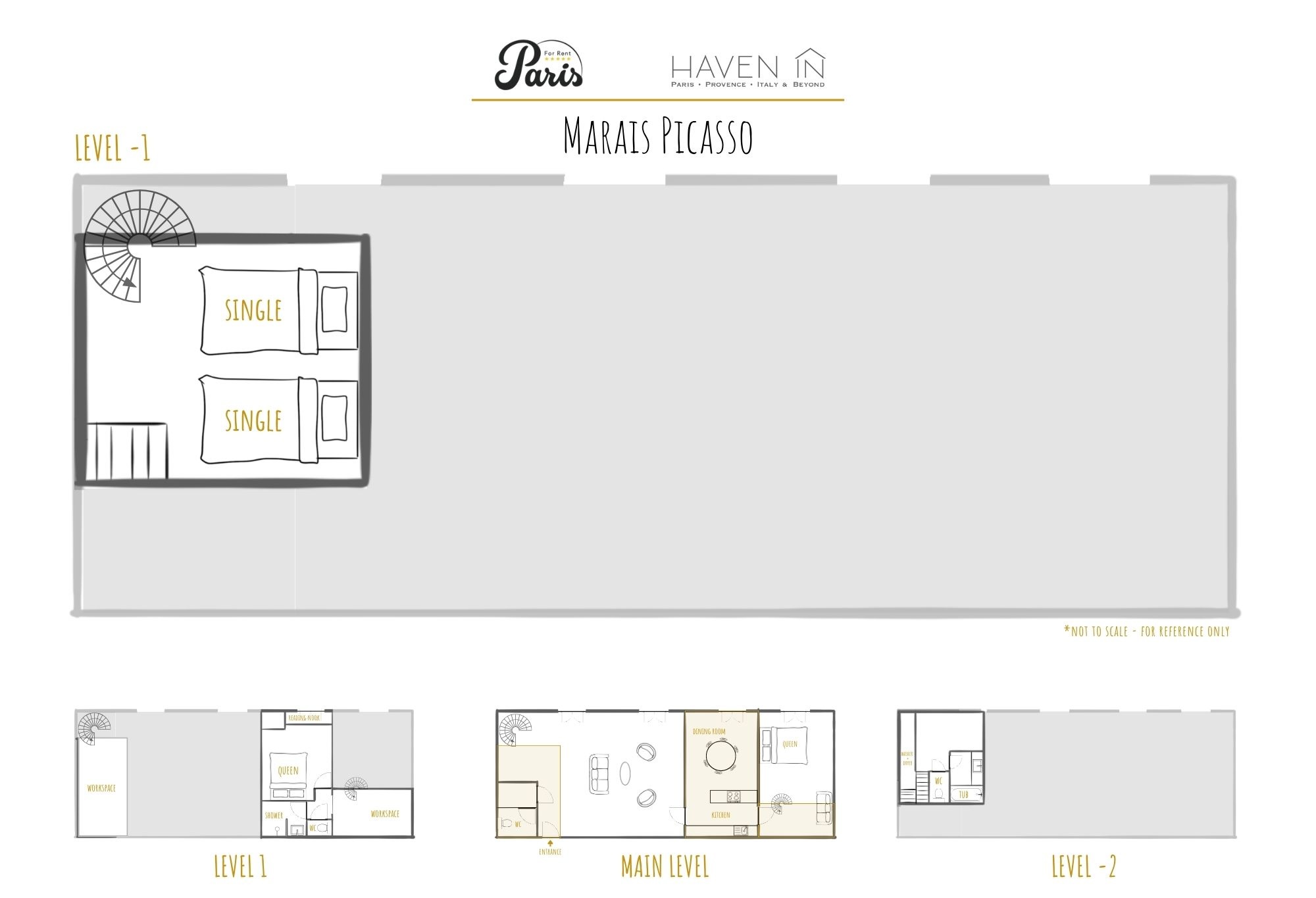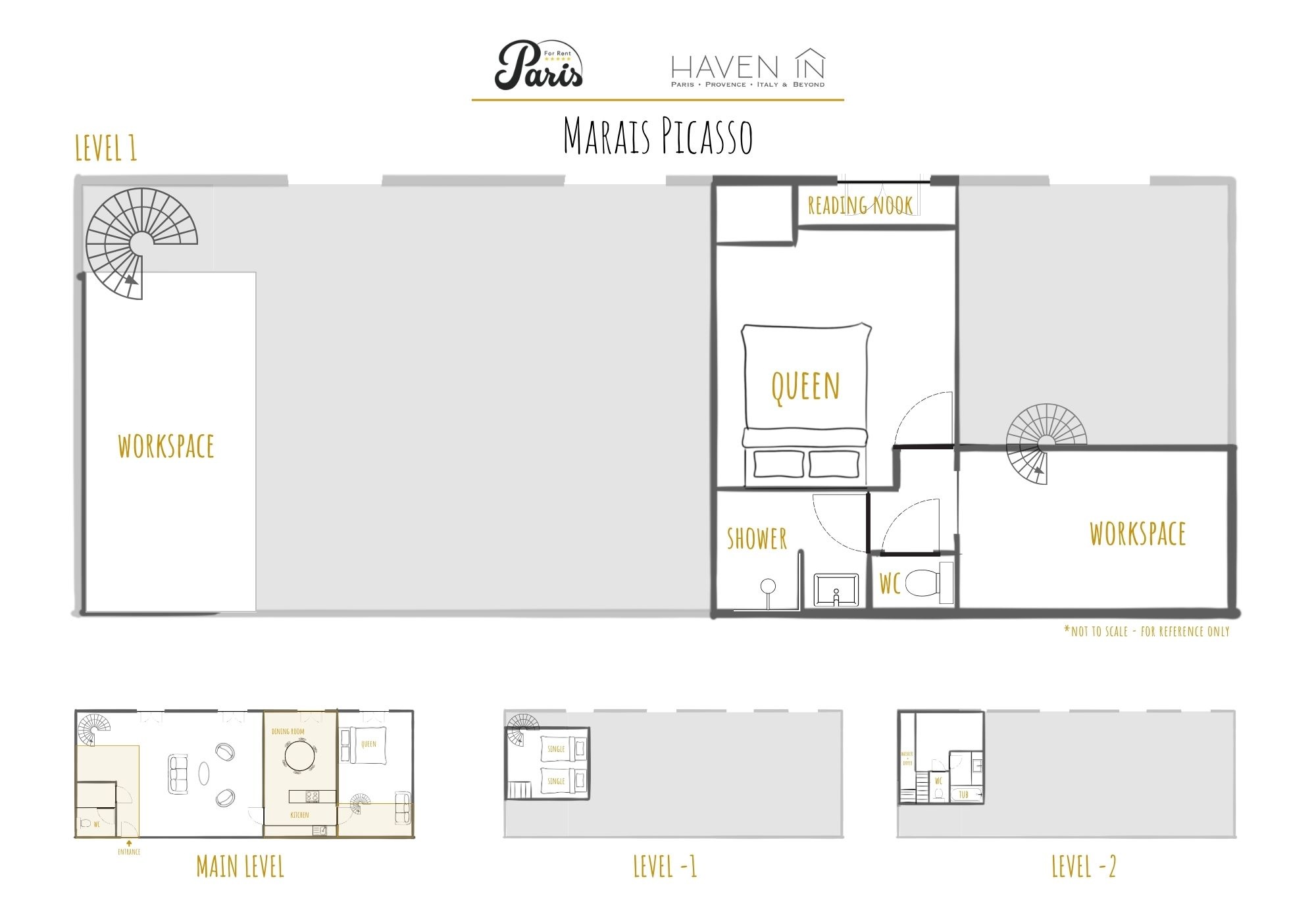 Master Bathroom(Full bath) walk-in shower, toilet, sink (Master bathroom is up on the mezzanine, one floor above master bedroom. The WC is separate.)Second Bathroom(Full bath) toilet, sink, combination tub/shower (This bathroom is one floor below the guest bedroom with the 2 single beds. The WC is adjacent.)Third Bathroom(Half bath) toilet, sink (Guests WC is left of the entrance door off the living room.)Haven In