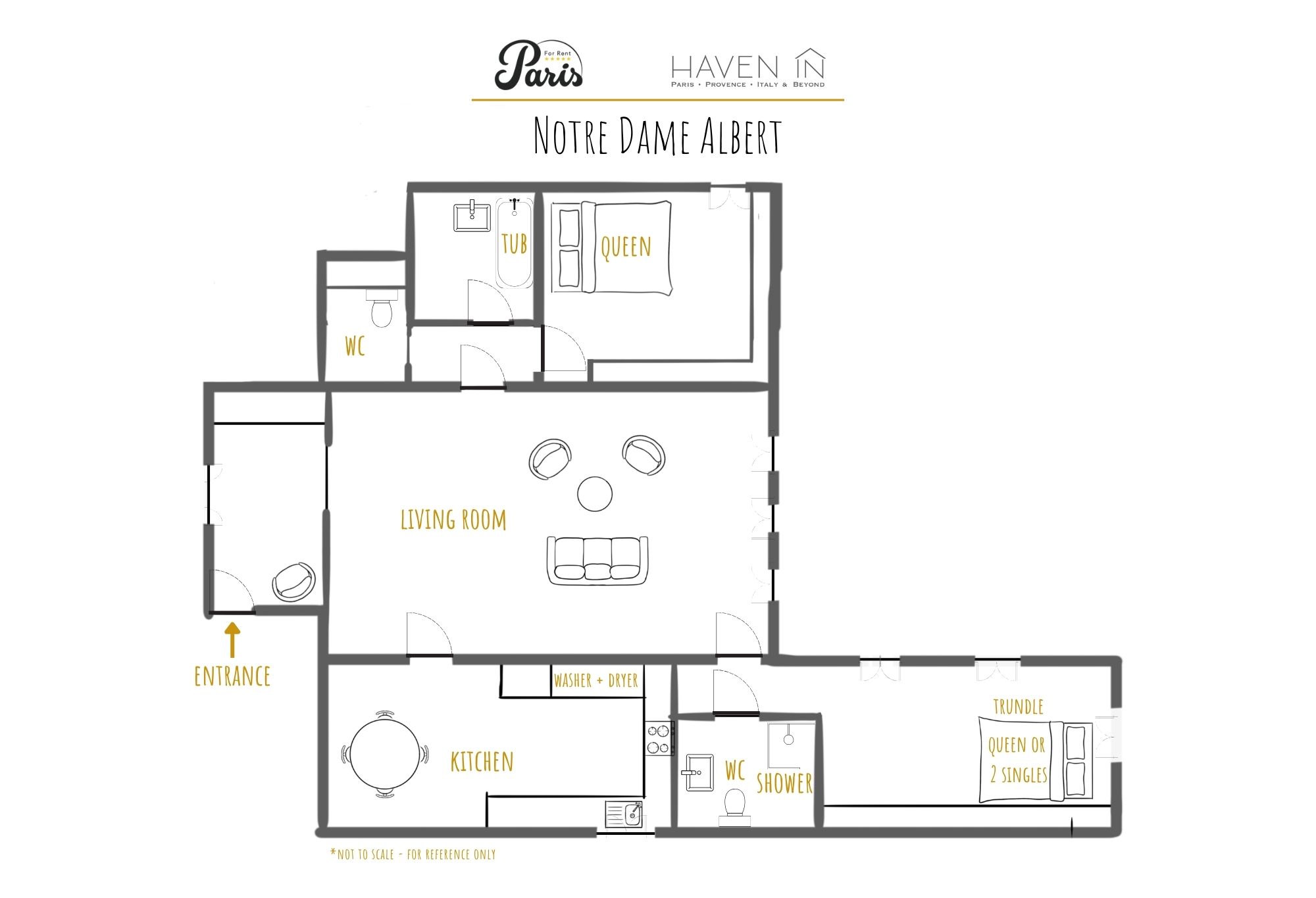 Discover the authentic charm of old Paris at Notre-Dame Albert, a welcoming 2-bedroom, 2-bath apartment in the Latin Quarter’s historic heart, just moments from Notre-Dame Cathedral, Ile de la Cité & St Germain-des-Prés. Located in an authentic period building with a quaint courtyard entrance and small elevator, this 120 m² residence blends Parisian tradition with modern comfort.