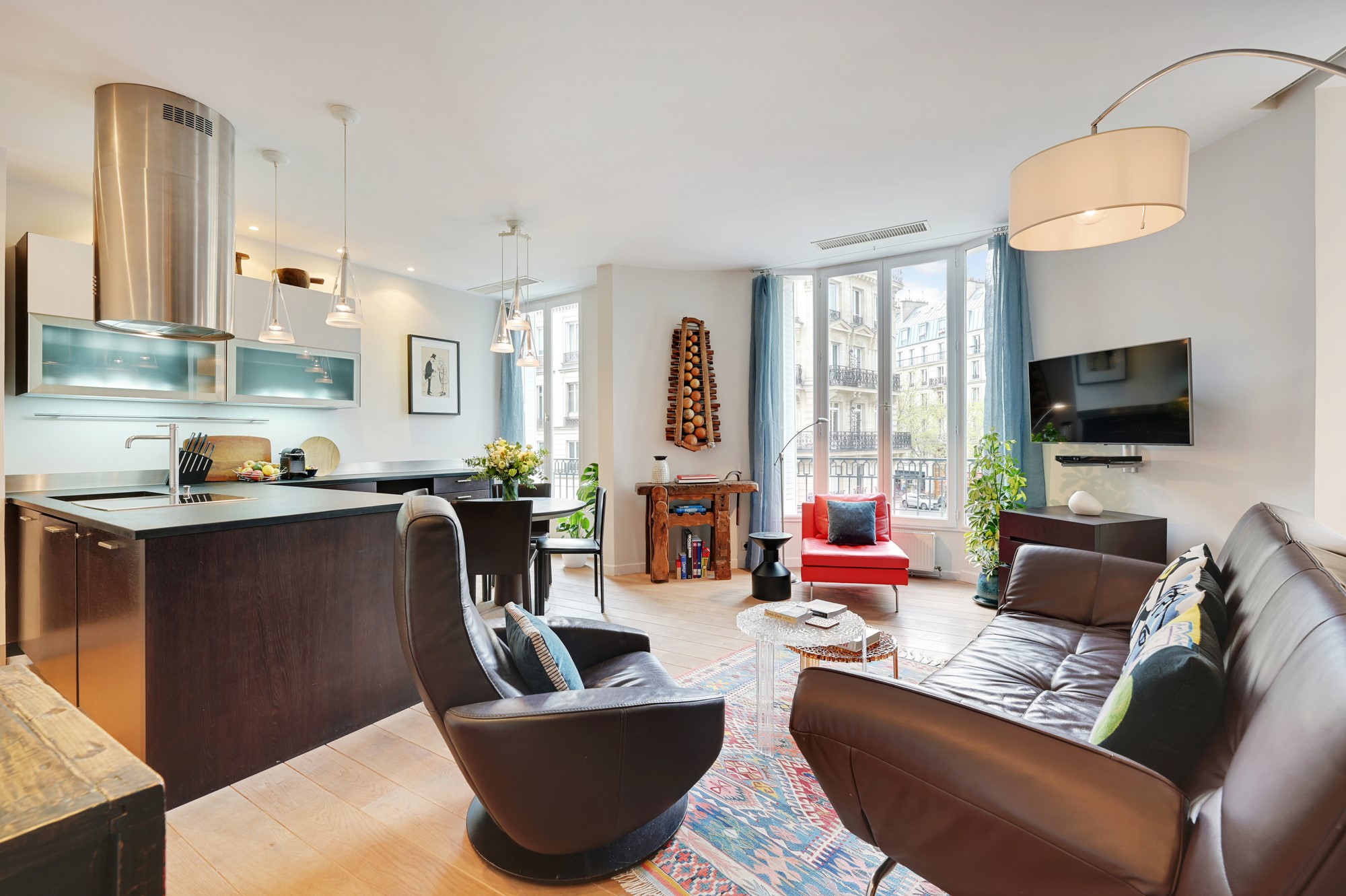 The main room has two double windows and an open floor plan comprising a living room, dining area, and kitchen. The living area features furniture by Ligne Roset, and includes a handsome leather arm chair in red and a brown leather sofa. The sofa also converts to a bed for two additional guests.