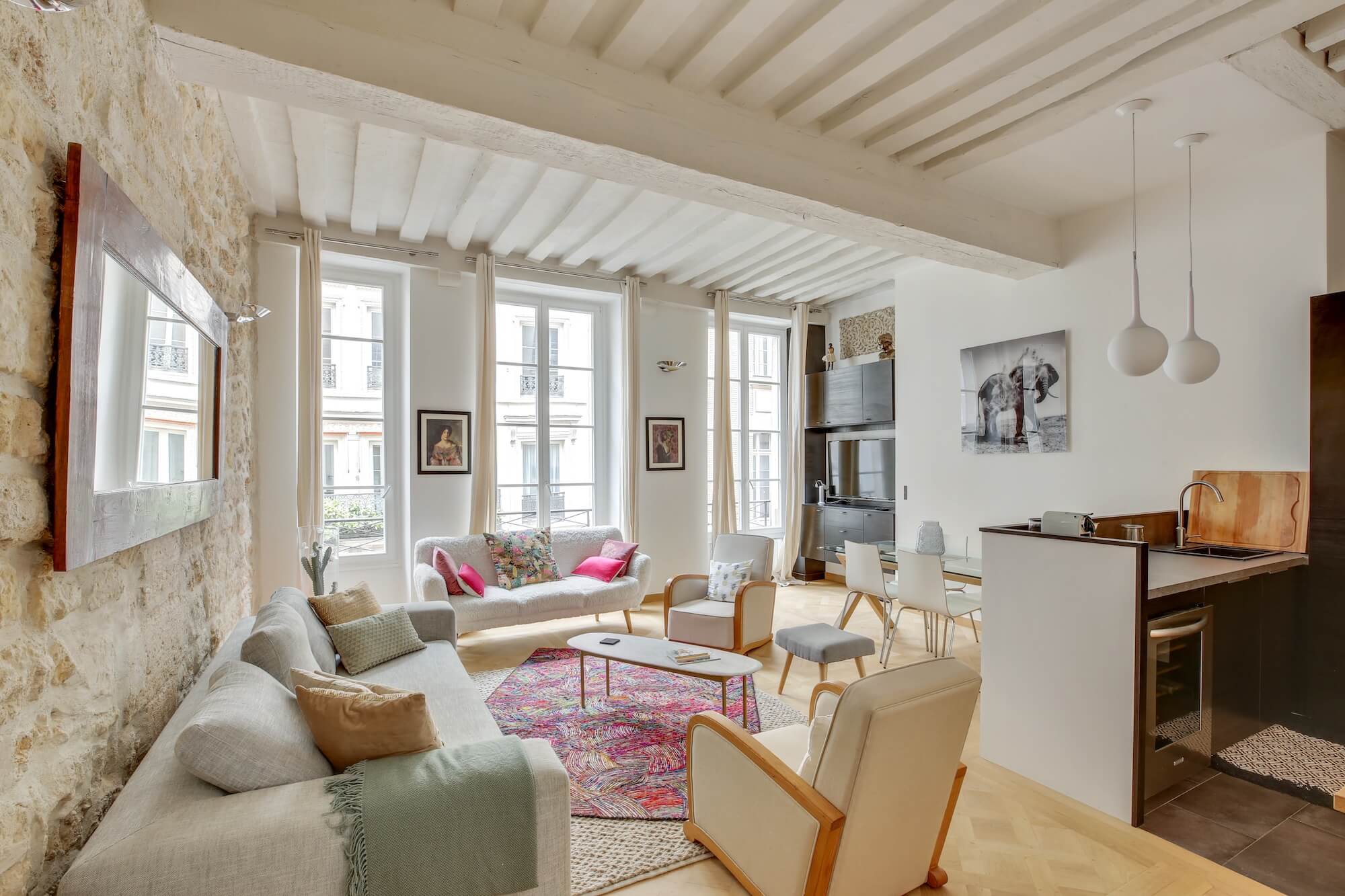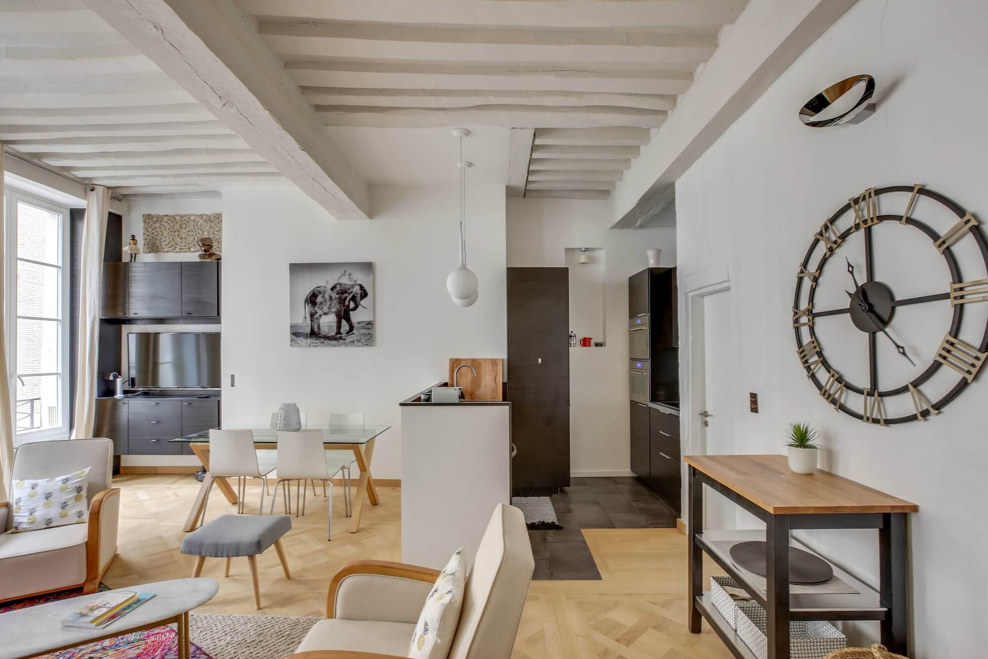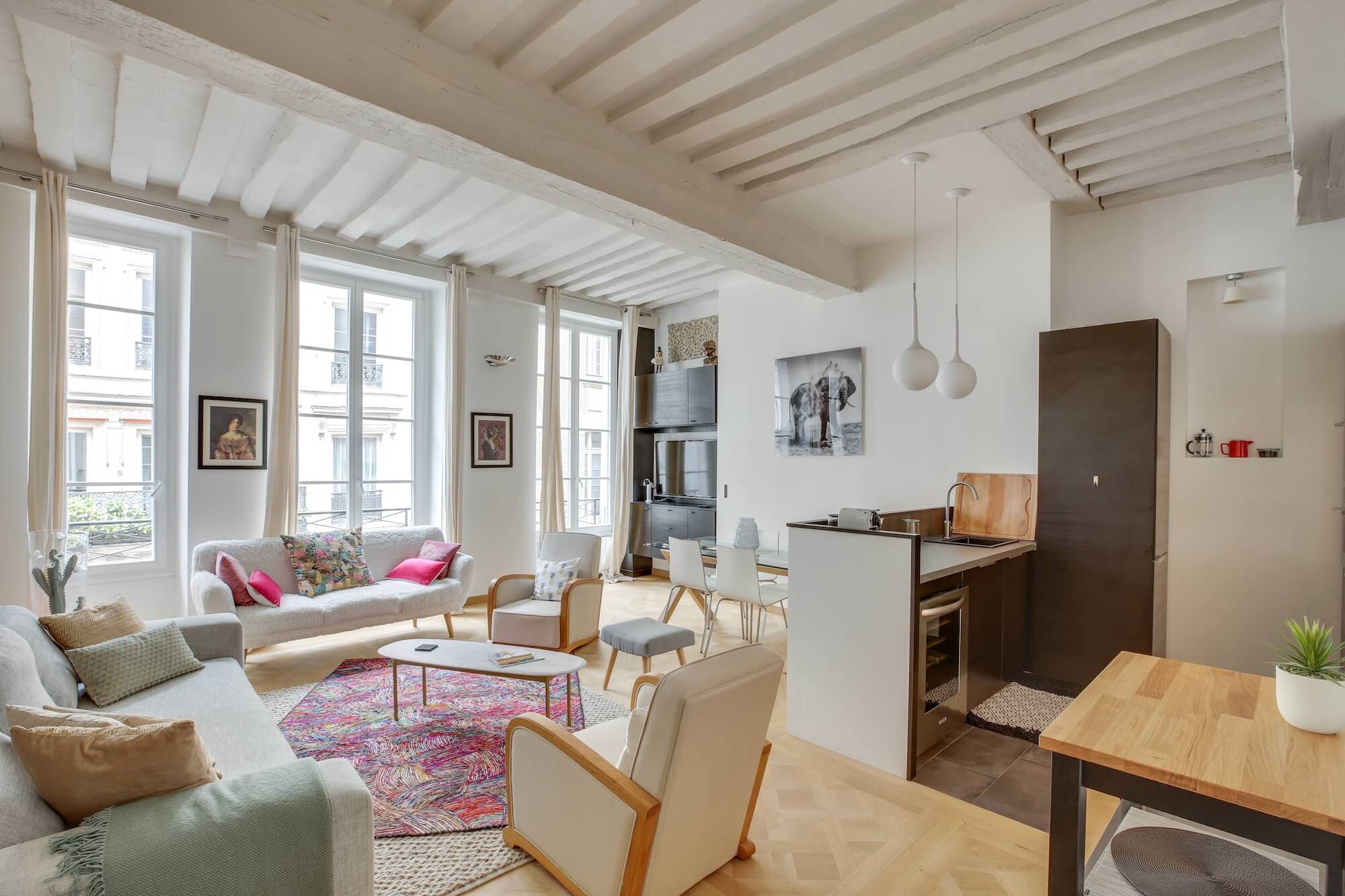 The thoughtfully appointed bedroom offers a calm and comfortable retreat, while the welcoming living area provides a relaxed setting for daily life in Paris. Filled with natural light, the apartment has an intimate, understated atmosphere that feels both authentic and lived-in — ideal for guests settling in for an extended stay.