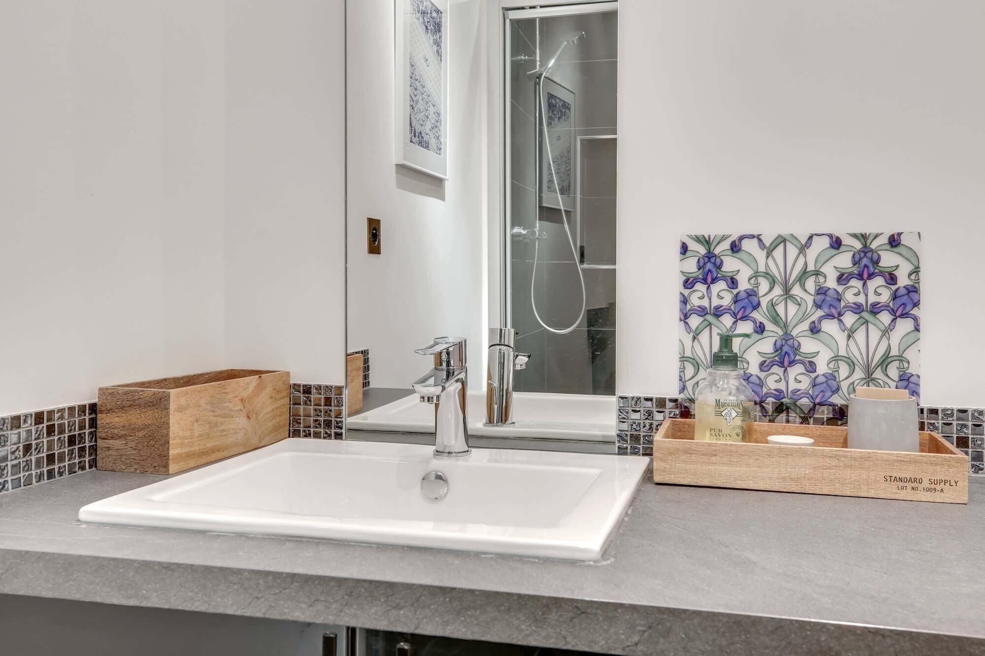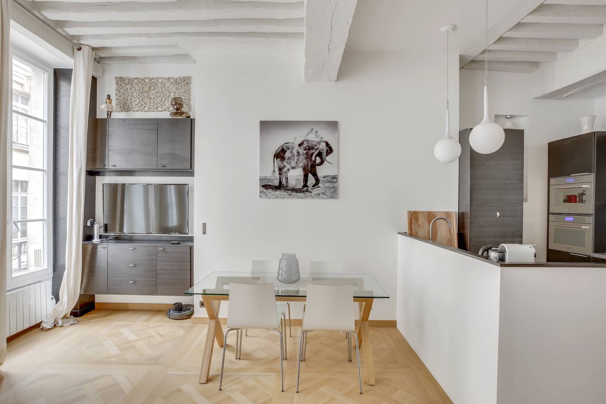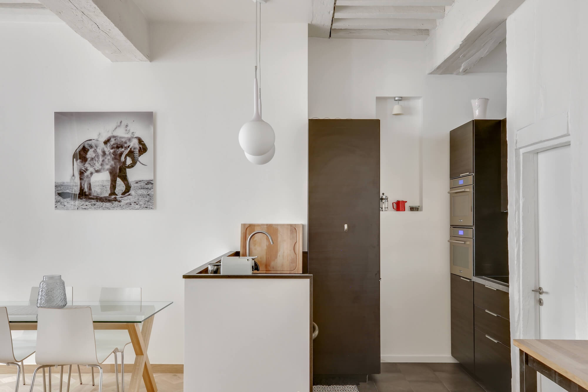 The thoughtfully appointed bedroom offers a calm and comfortable retreat, while the welcoming living area provides a relaxed setting for daily life in Paris. Filled with natural light, the apartment has an intimate, understated atmosphere that feels both authentic and lived-in — ideal for guests settling in for an extended stay.